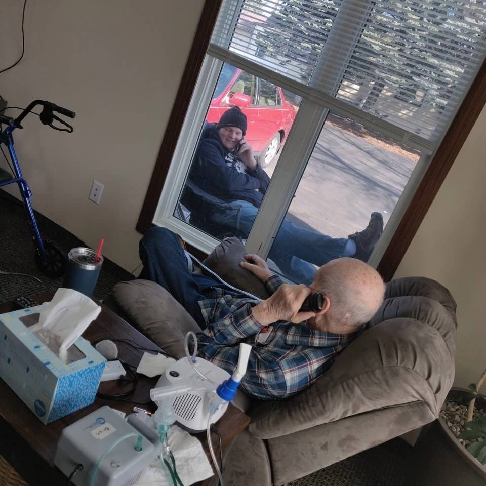 A man visits with his elderly father through a window: