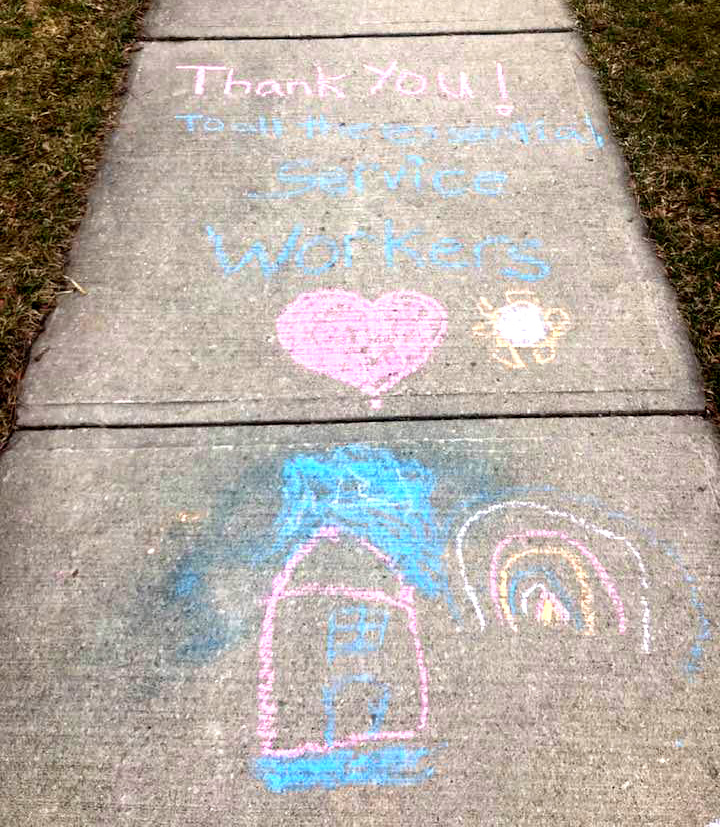 Sidewalk drawings done by families in east end Belleville to try and spread positive messages during the COVID-19 outbreak. (Submitted / Leslee Uddenberg)