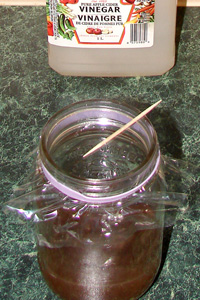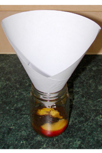 3. Pour apple cider vinegar in a container with old fruit (bananas work very well). Place a rolled up piece of paper in the jar, narrow opening down. The cone will direct them to the opening but make it difficult to exit.